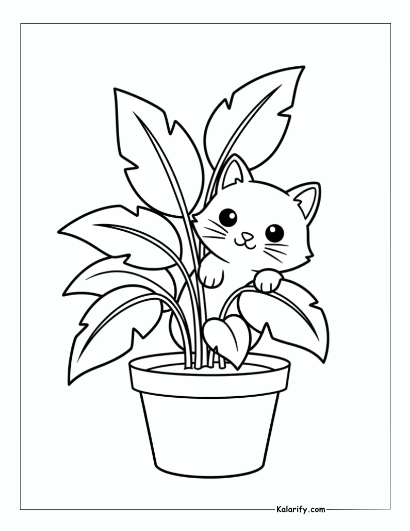 Be the first to review “Cat peering out from a potted plant coloring page”