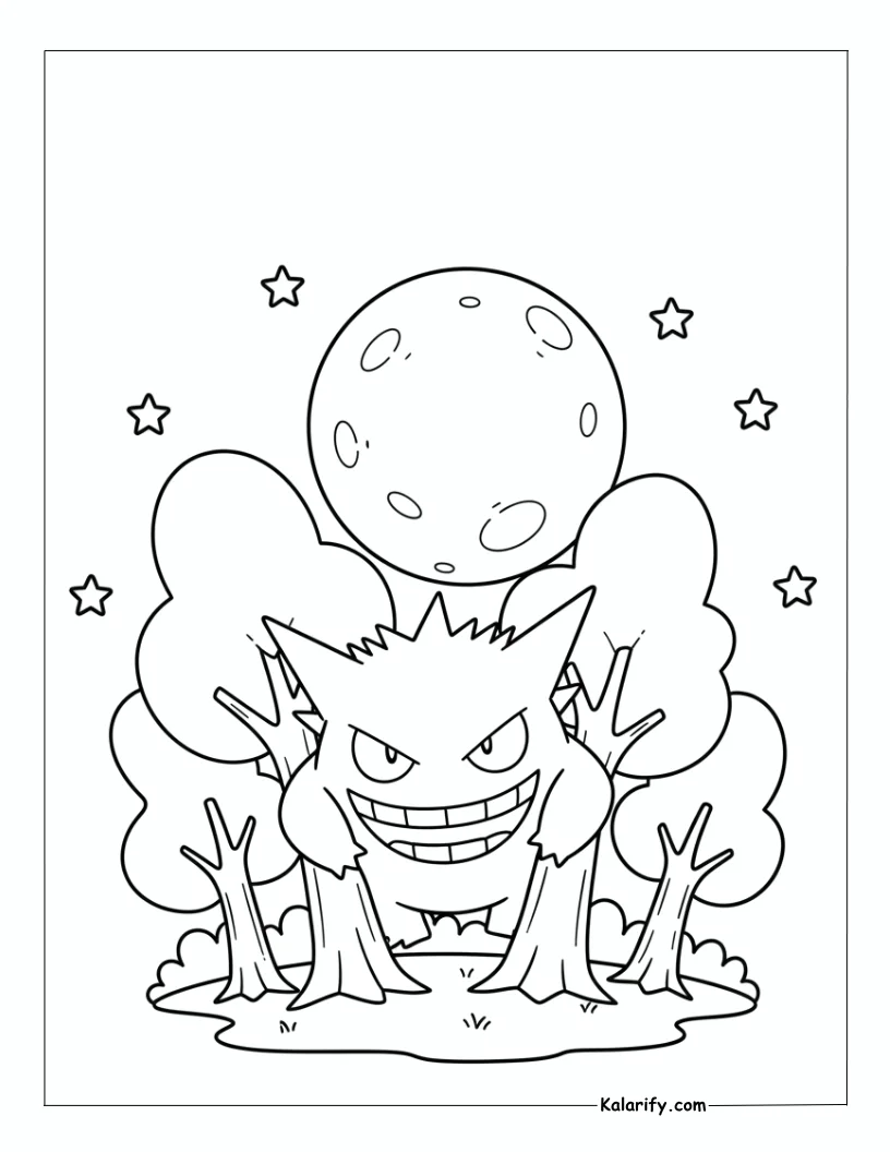 Be the first to review “Gengar peeking playfully from behind trees coloring page”